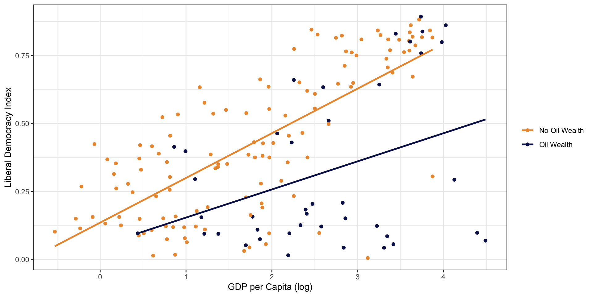 Wealth predicts greater democracy, but to a lesser degree when that wealth is driven by oil wealth