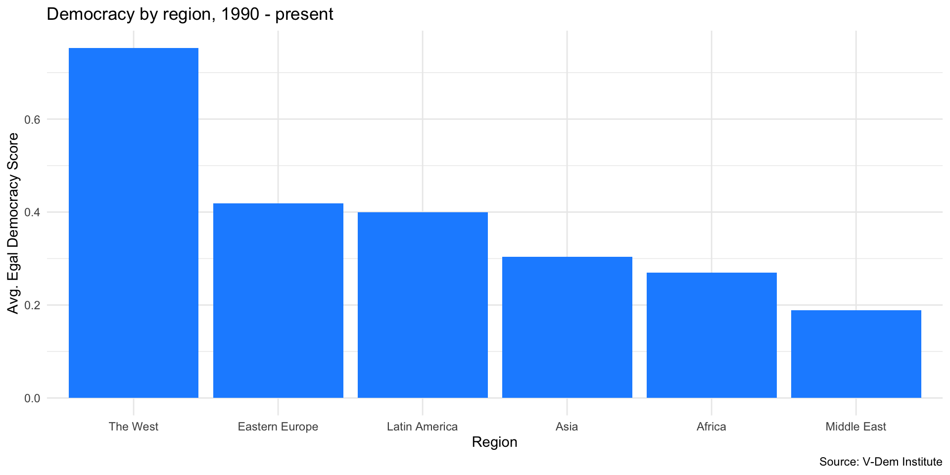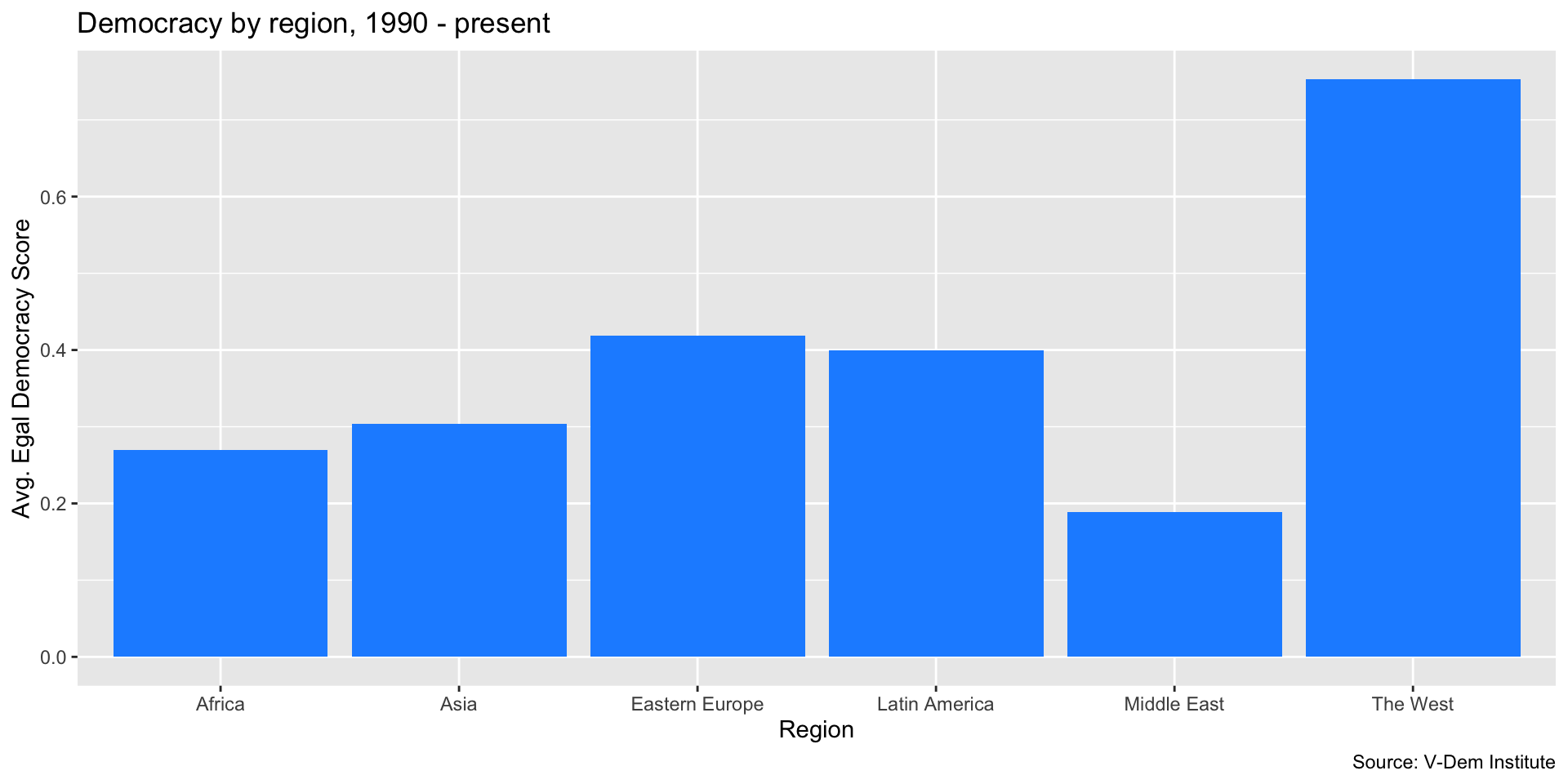 ggplot(dem_summary, aes(x = region, y = mean_egal_dem)) +geom_col(fill ="dodgerblue") +labs(x ="Region", y ="Avg. Egal Democracy Score", title ="Democracy by region, 1990 - present", caption ="Source: V-Dem Institute" )
