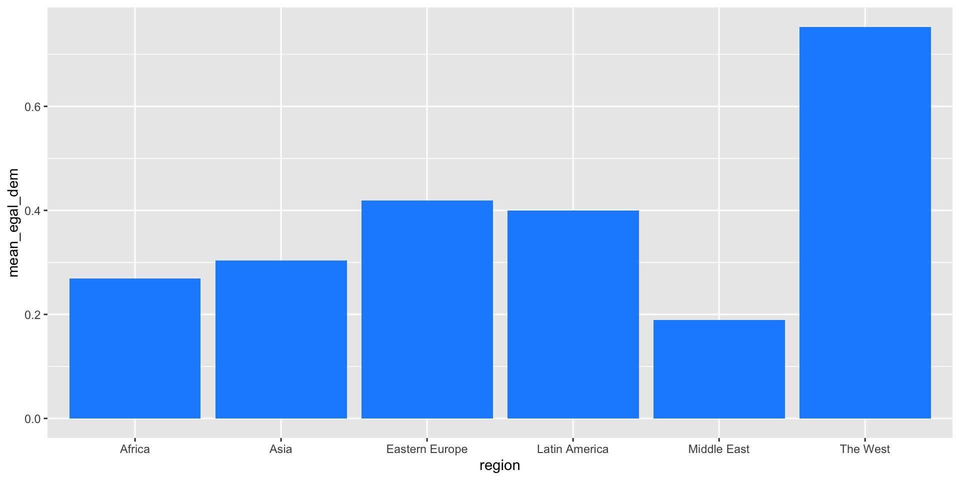 ggplot(dem_summary, aes(x = region, y = mean_egal_dem)) +geom_col(fill ="dodgerblue")