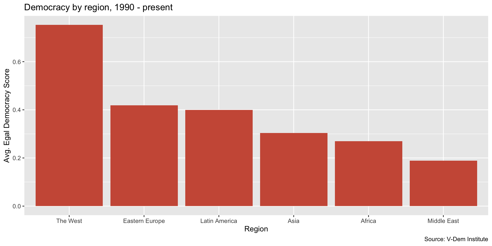 dem_bar_chart <-ggplot(dem_summary, aes(x =reorder(region, -mean_egal_dem), y = mean_egal_dem)) +geom_col(fill ="dodgerblue") +labs(x ="Region", y ="Avg. Egal Democracy Score", title ="Democracy by region, 1990 - present", caption ="Source: V-Dem Institute" ) +theme_minimal()