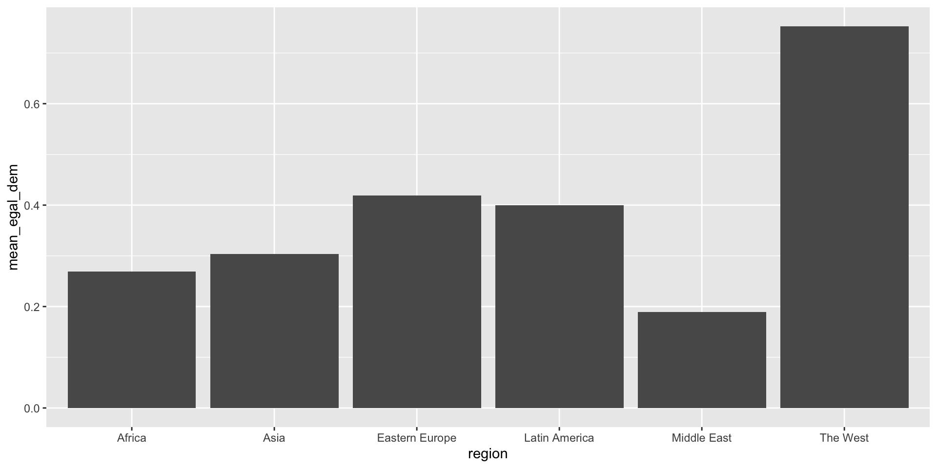 # create summary data objectdem_summary <- myData%>%group_by(region) %>%summarize(mean_egal_dem =mean(v2x_egaldem, na.rm=TRUE))dem_summary
